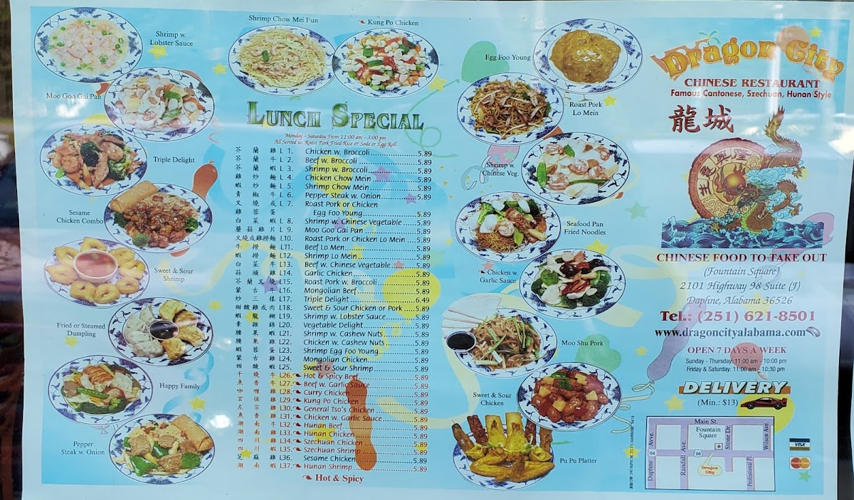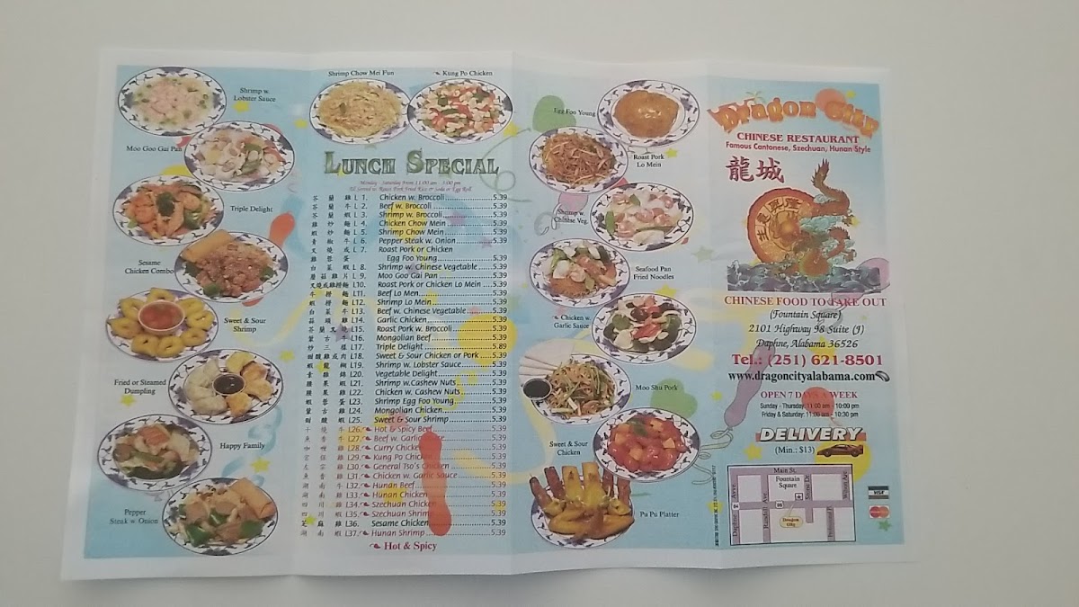Dragon City, located at 2101 US-98 Suite J in Daphne, AL, offers an extensive and varied menu that caters to diverse tastes, ensuring there's something for everyone. The Seafood section features a range of flavorful dishes, including Shrimp With Snow Peas ($9.95), Shrimp With Garlic Sauce ($9.95), and the bold Curry Shrimp With Onion ($9.95), each offering a unique blend of fresh ingredients and savory sauces. For a more adventurous taste, there are the Szechuan Shrimp and Hunan Shrimp ($9.95), each bringing a spicy kick.